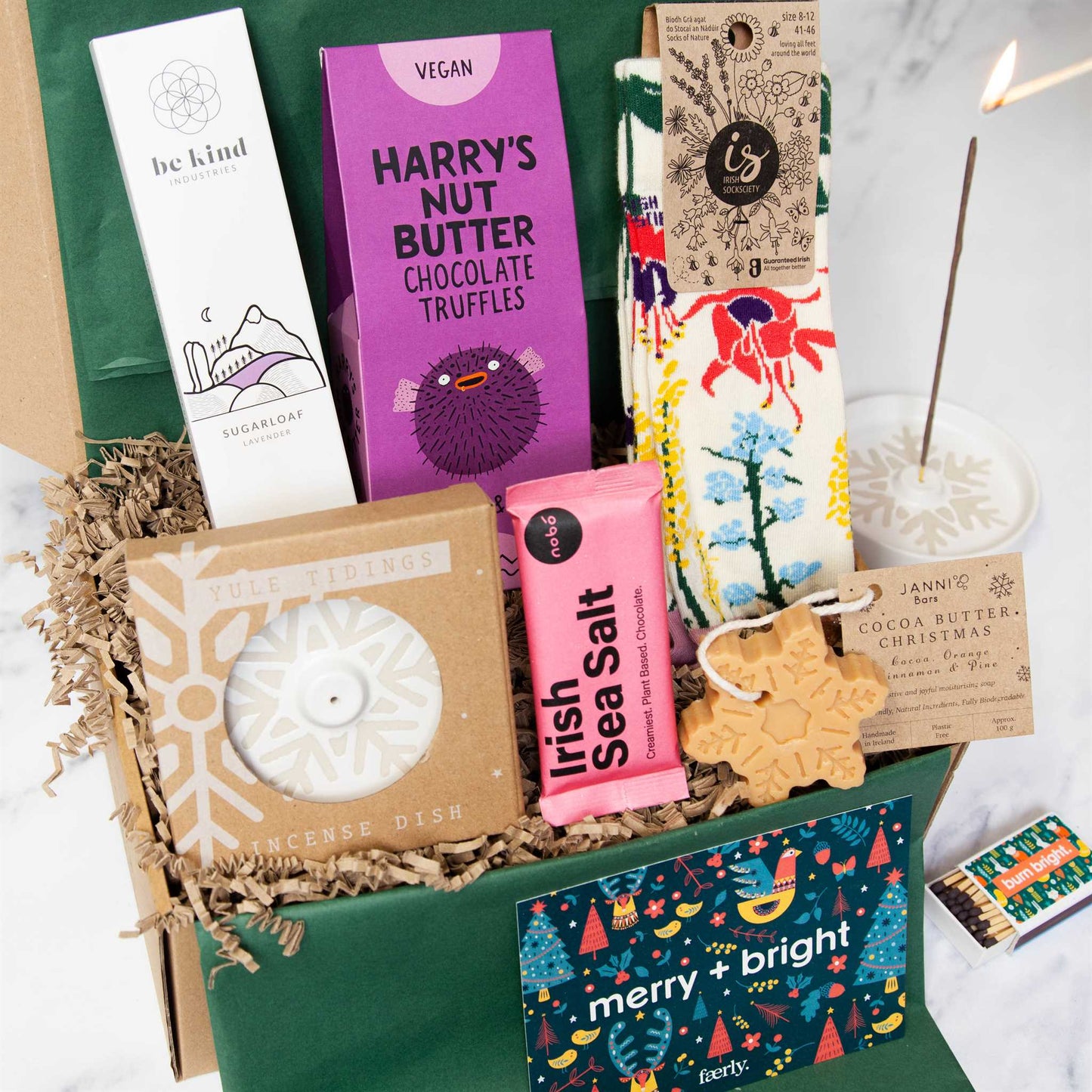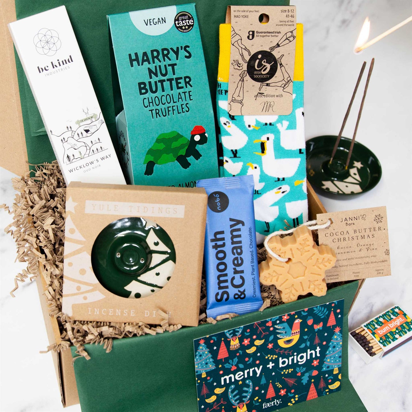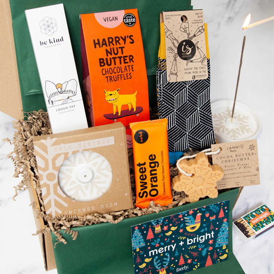 Indulge in some festive self-care with the 'Treat Yo-Self Holiday Edition' Gift Box. This colourful package includes Harry’s Nut Butter Chocolate Truffles, snug Irish Socksciety socks, a Nobó Chocolate Bar, Be Kind Incense, a stoneware incense burner, and a Janni Snowflake Soap. It's the ultimate holiday pamper kit.