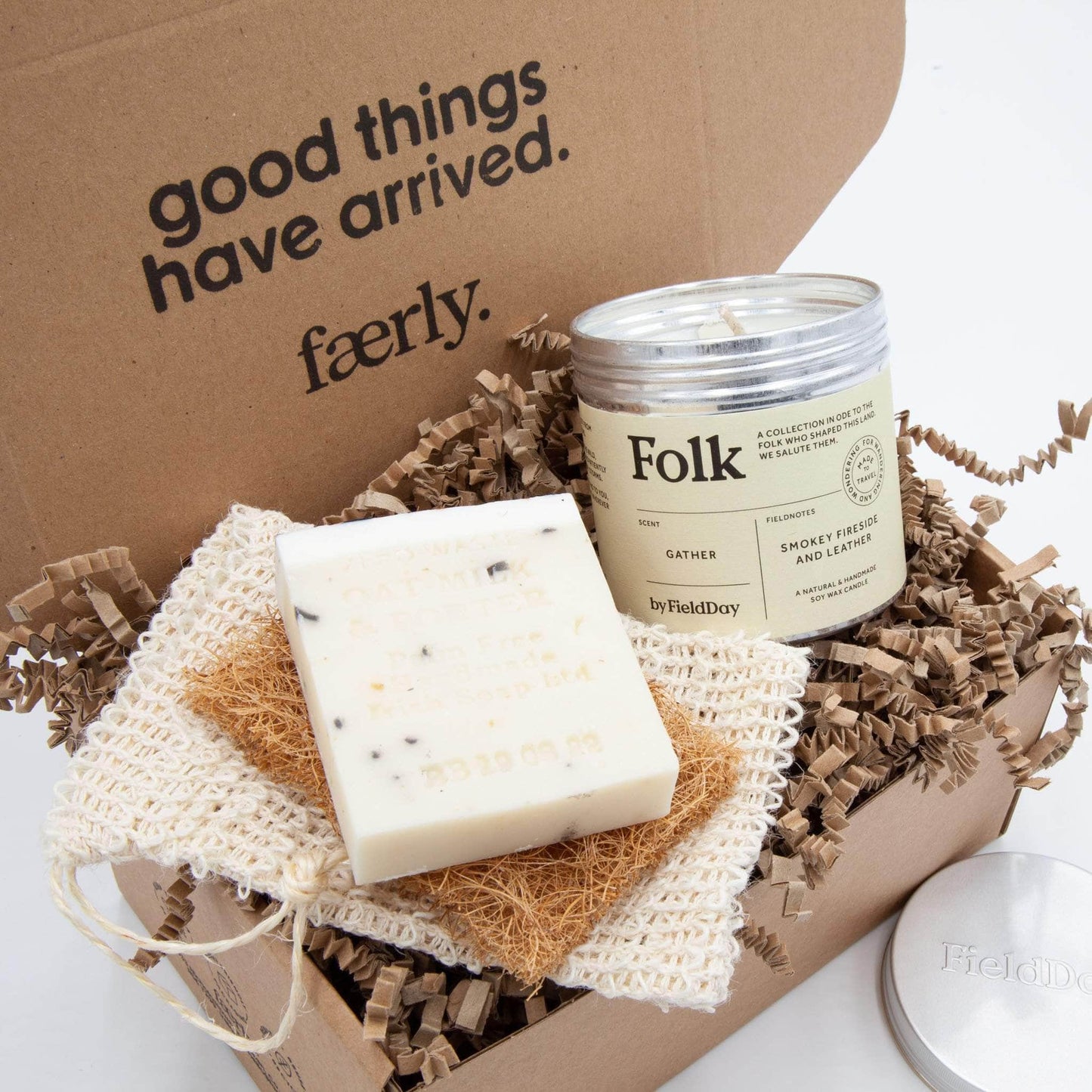 - Gather Candle (leather and smokey fireside notes) with Oat Milk & Porter soap