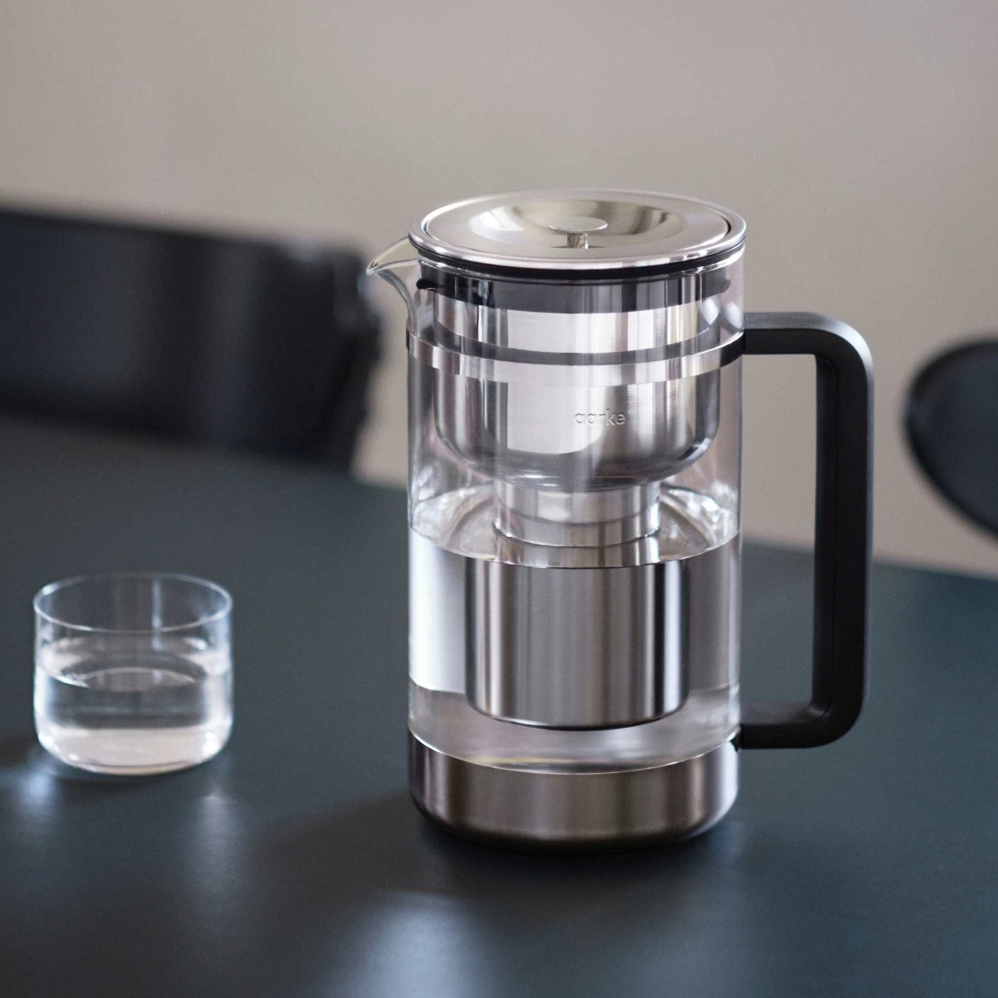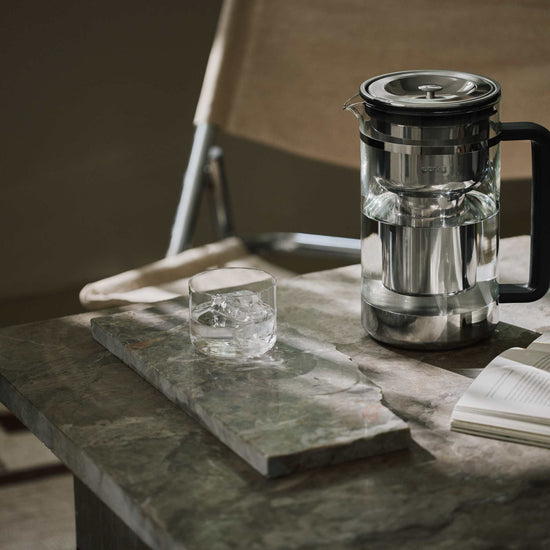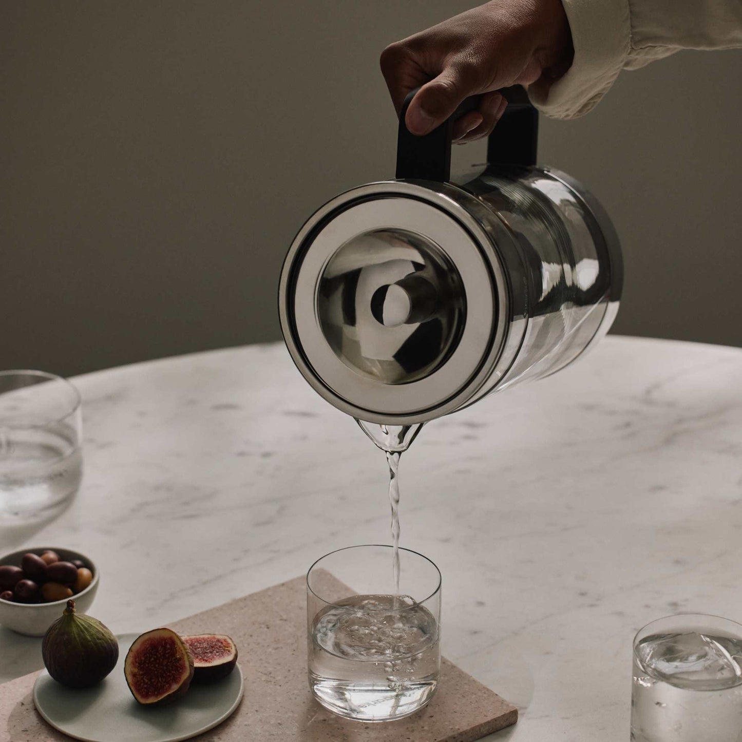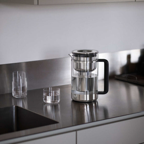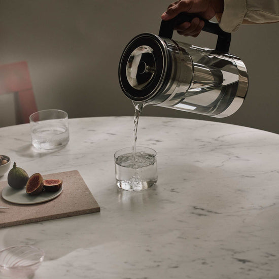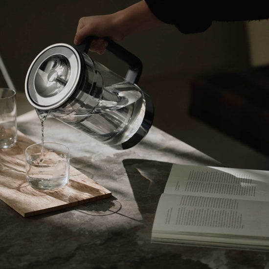 The Purifier Large is a timeless glass carafe water filter jug with no plastic cartridges. Instead: a refillable stainless-steel cartridge with filter granules inside. Purifier Large features the same filter technology as the original Purifier, and holds a larger volume of almost 1.7 L of filtered water.