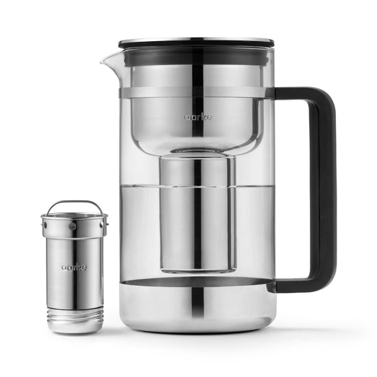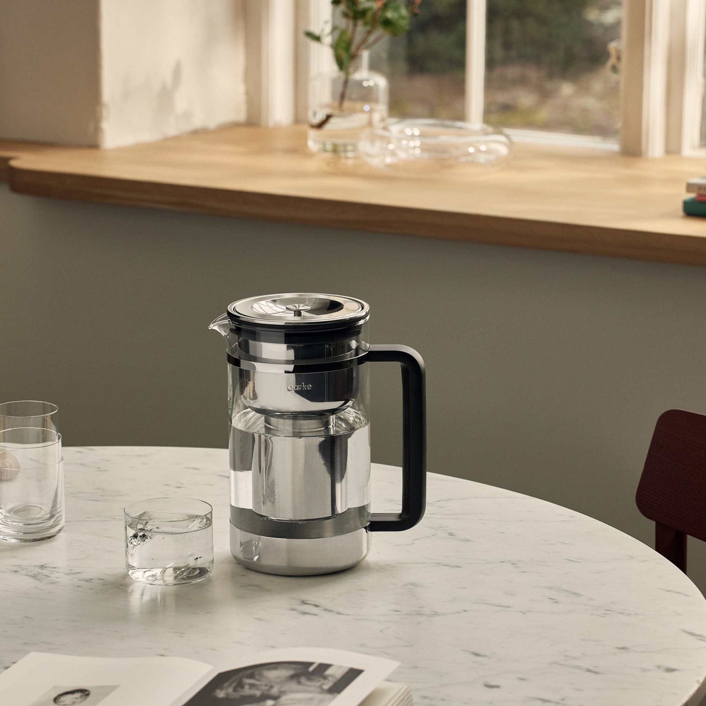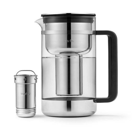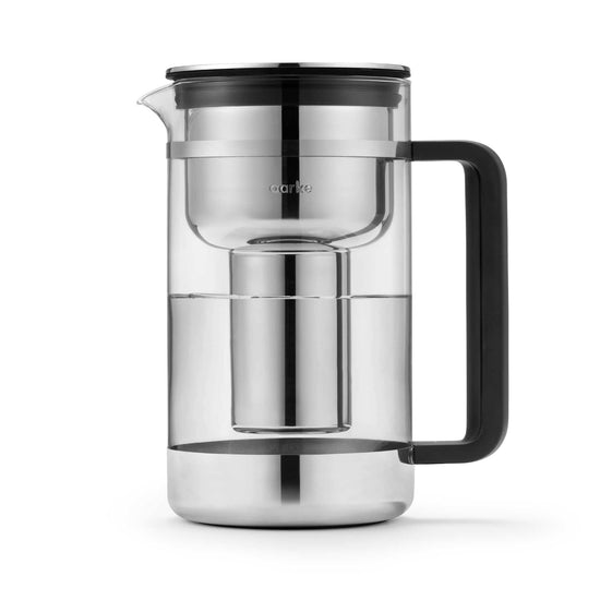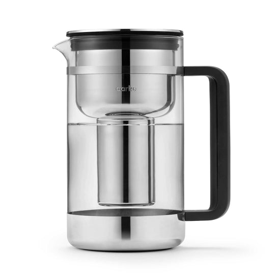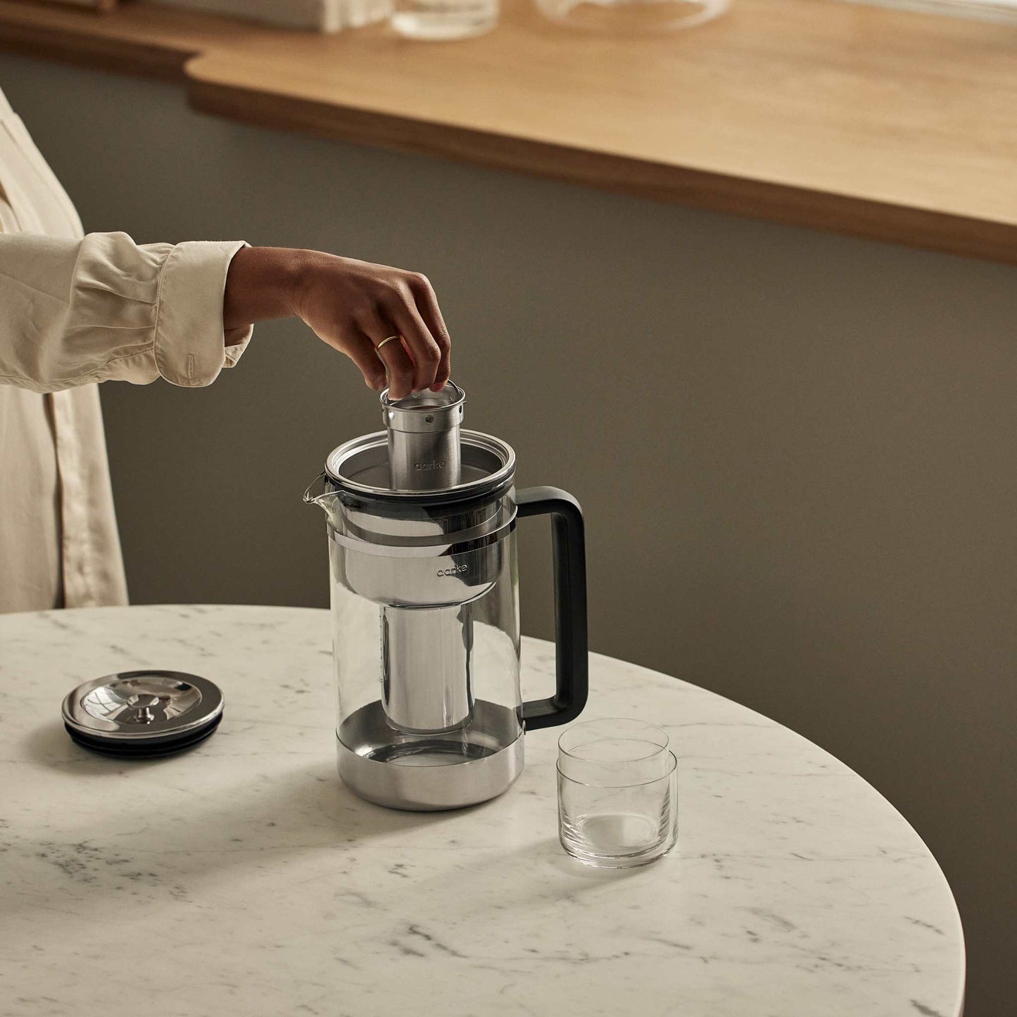 The Purifier Large is a timeless glass carafe water filter jug with no plastic cartridges. Instead: a refillable stainless-steel cartridge with filter granules inside. Purifier Large features the same filter technology as the original Purifier, and holds a larger volume of almost 1.7 L of filtered water.
