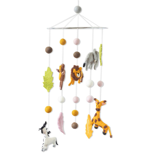 A beautiful addition to any nursery, this colourful felted baby mobile is handmade in Nepal from natural muesling-free wool. Baby will be fascinated by all the African animals like lions, zebras, monkeys and elephants.