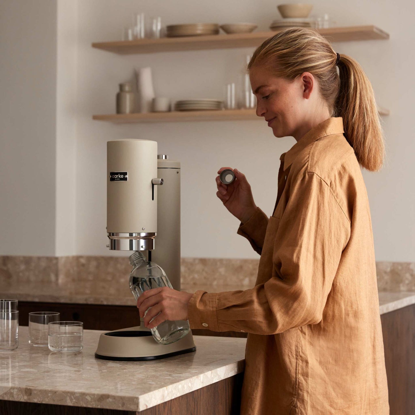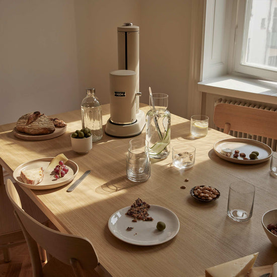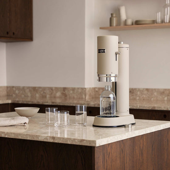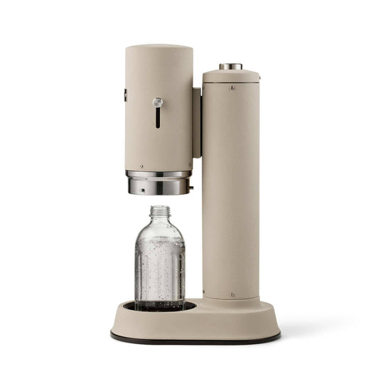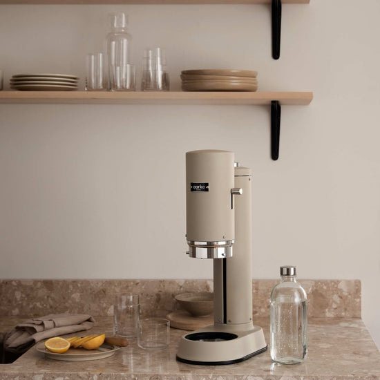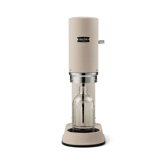 The Aarke Carbonator Pro is a unique sparkling water maker in Sand, with a sturdy, dishwasher safe glass bottle. The Carbonator Pro incorporates a simple one-handed operation with the innovative Push-to-Lock™ feature for a great carbonation experience. Just place the bottle in the base, push down the cover, carbonate, release, enjoy.
