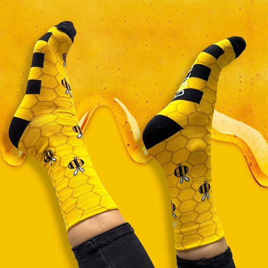 Buzzin' socks are the winning design of the 2023 edition of Irish Socksciety's Design Your Own Socks Competition designed by the very talented Rachel Rothwell.