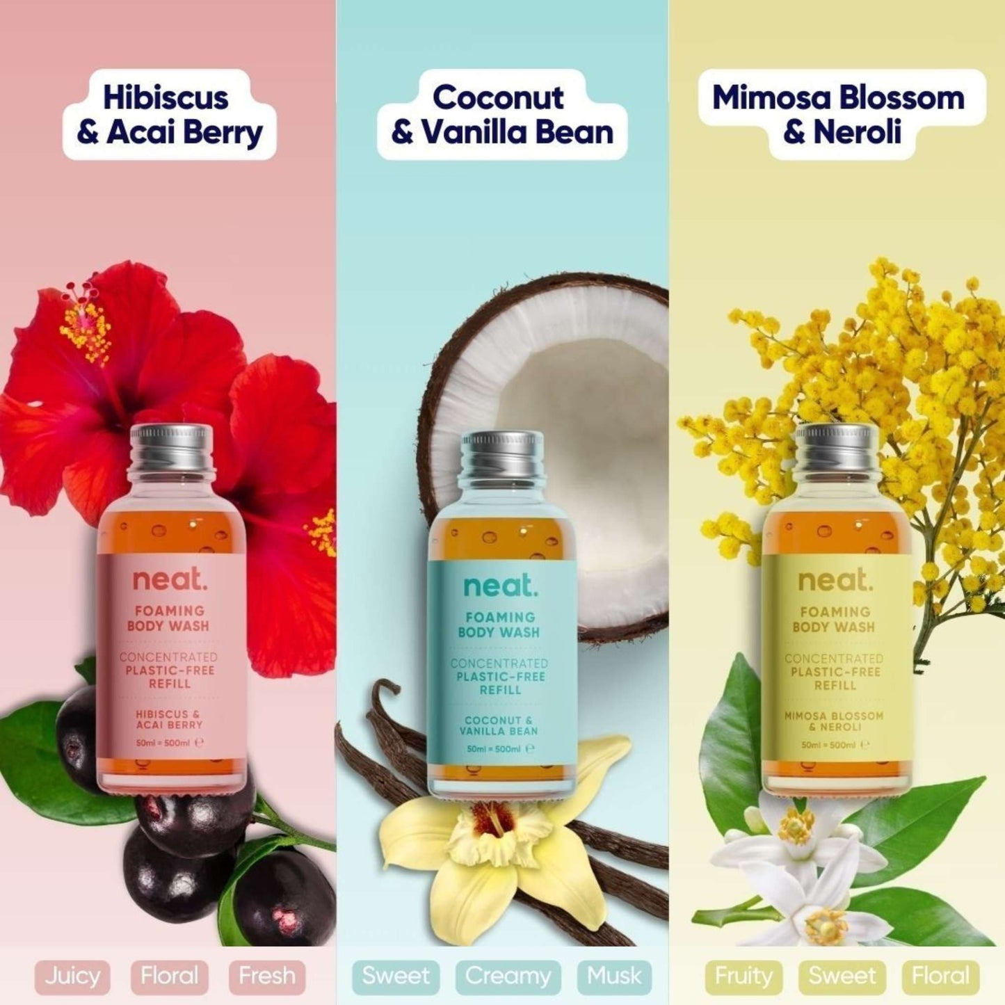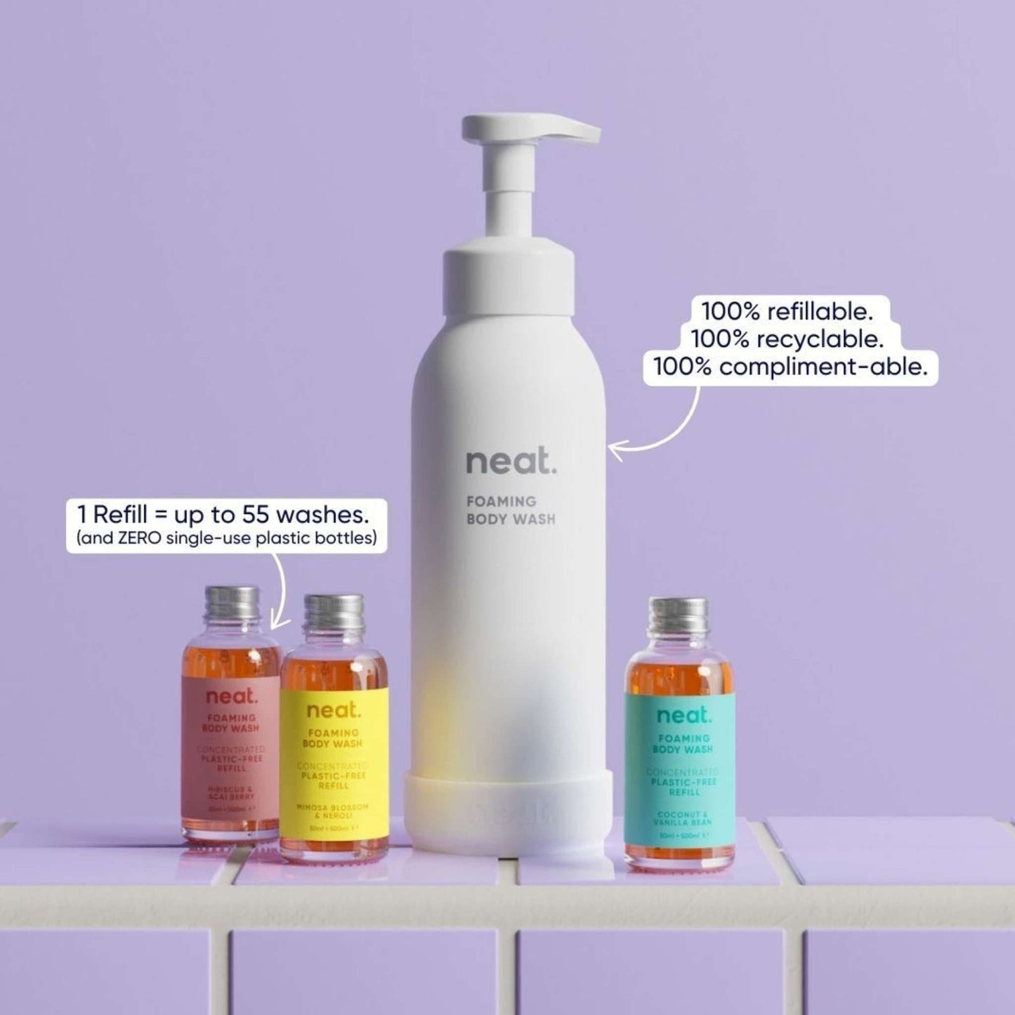 Neat’s Foaming Body Wash is the latest addition to their plastic-free, luxuriously scented product range. This Starter Pack contains a refillable aluminium bottle and concentrated refill to transform tap water into a nourishing, coconut and vanilla bean foaming body wash.