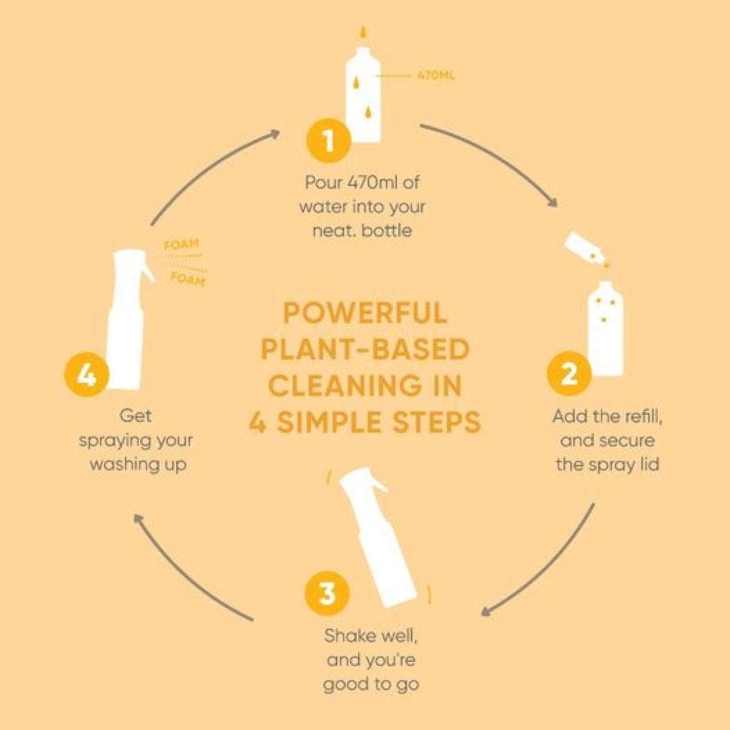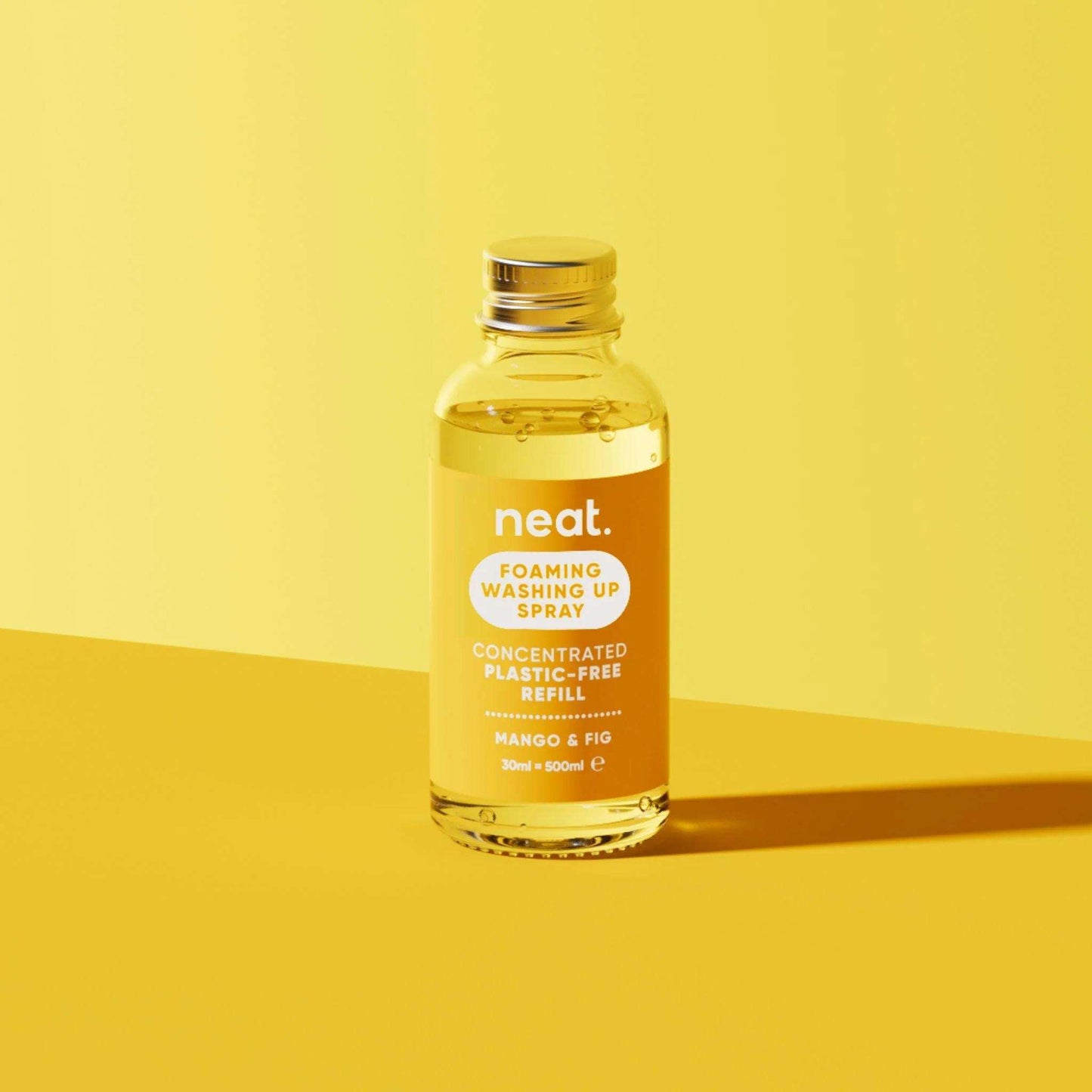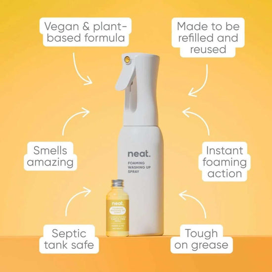 Neat’s Foaming Washing Up Spray Refill is a revolutionary way to wash up. This concentrated refill delivers powerful foaming and cleaning action. It tackles tough grease and grime with ease and a tropical scent of juicy mango and sweet fig.
