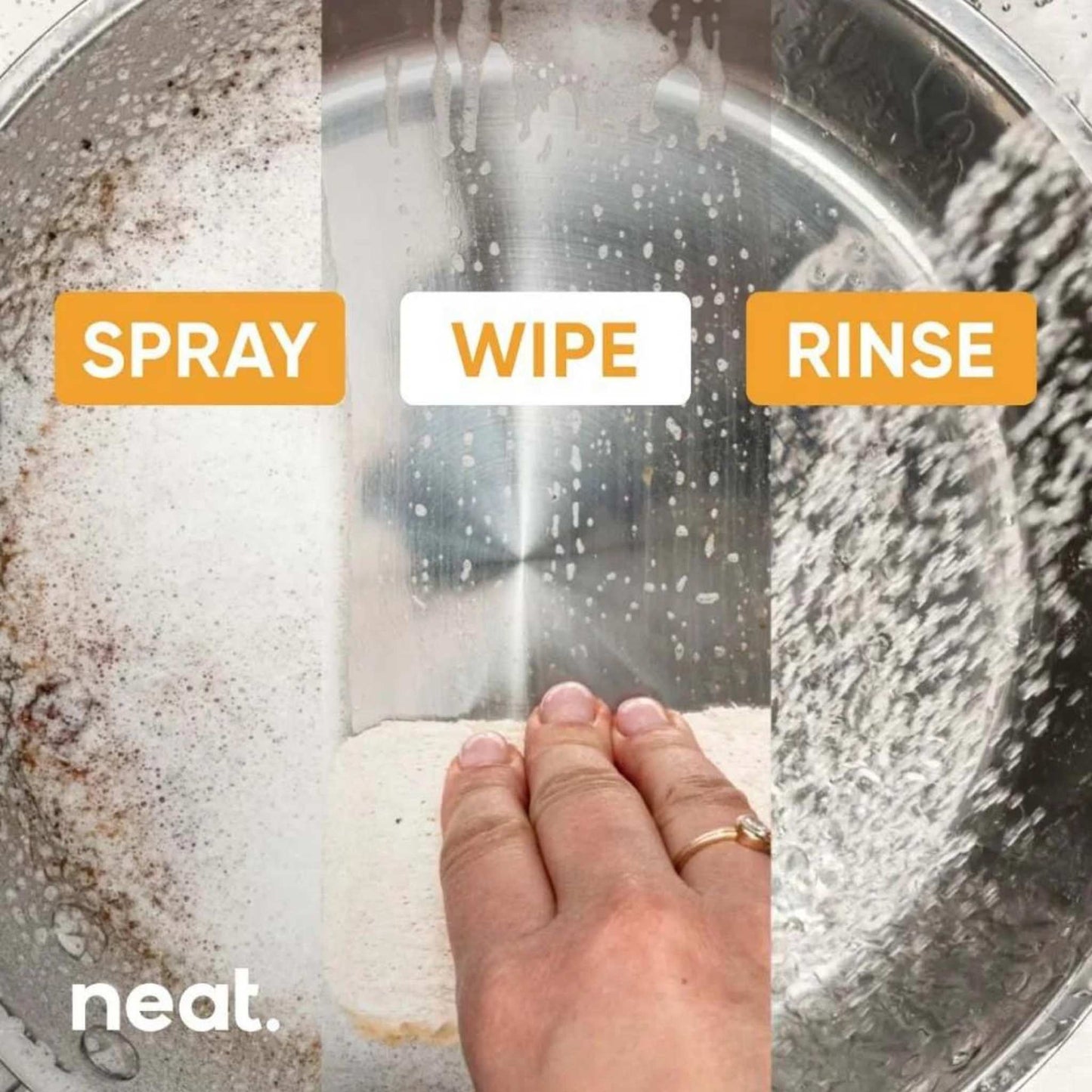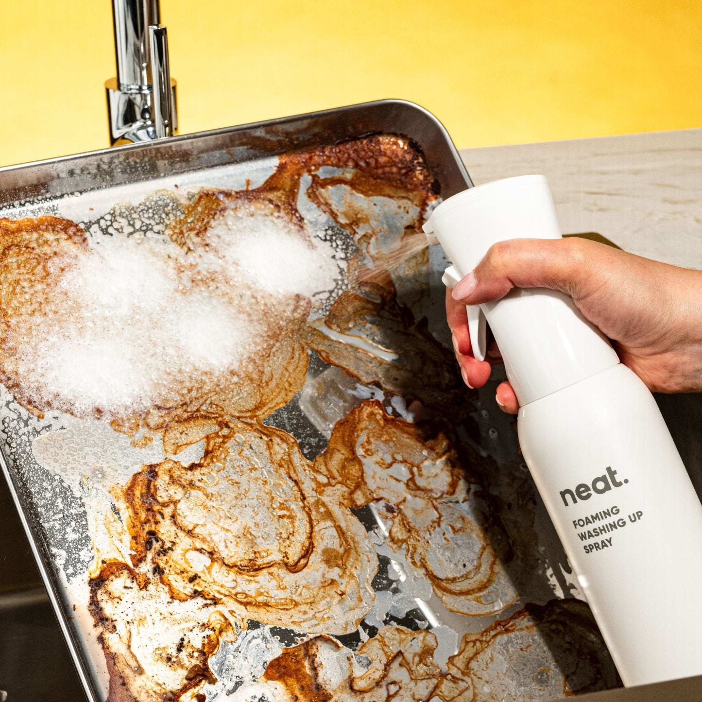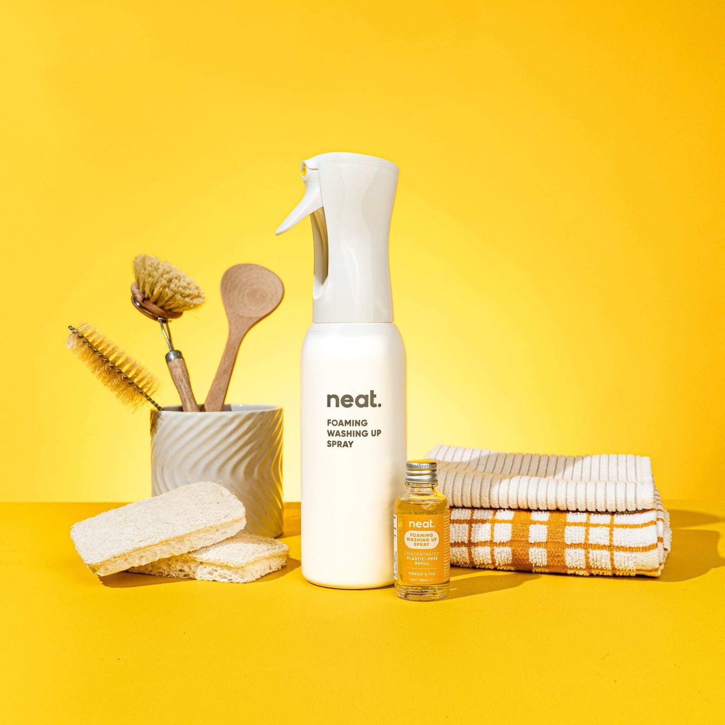 Neat’s Foaming Washing Up Spray is the first refillable foaming washing-up spray to launch in Ireland from a concentrated refill. It’s rich foam penetrates and lifts away tough grease and grime, leaving dishes spotless.