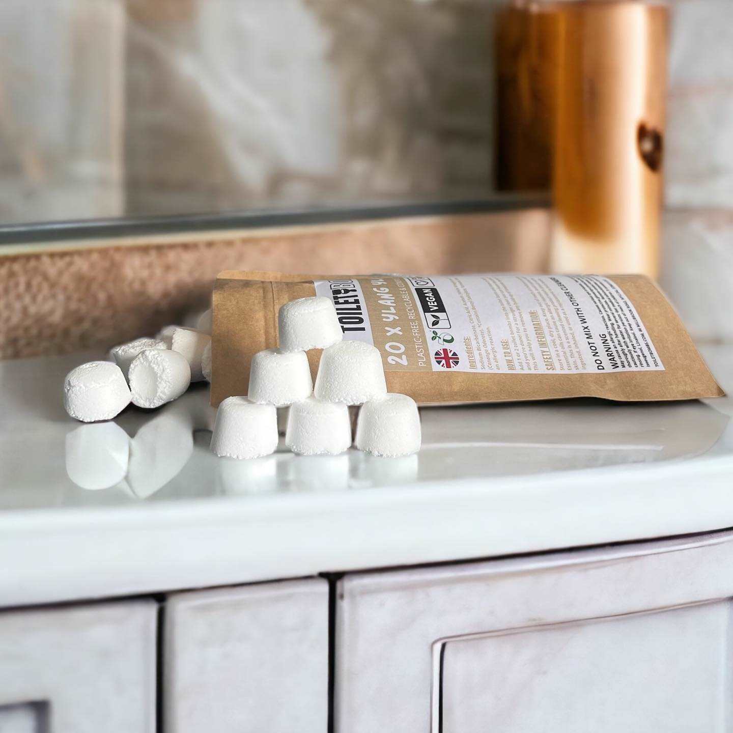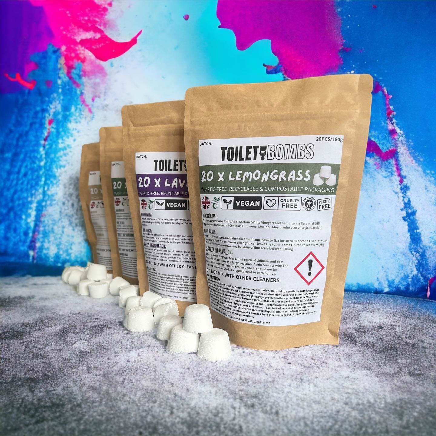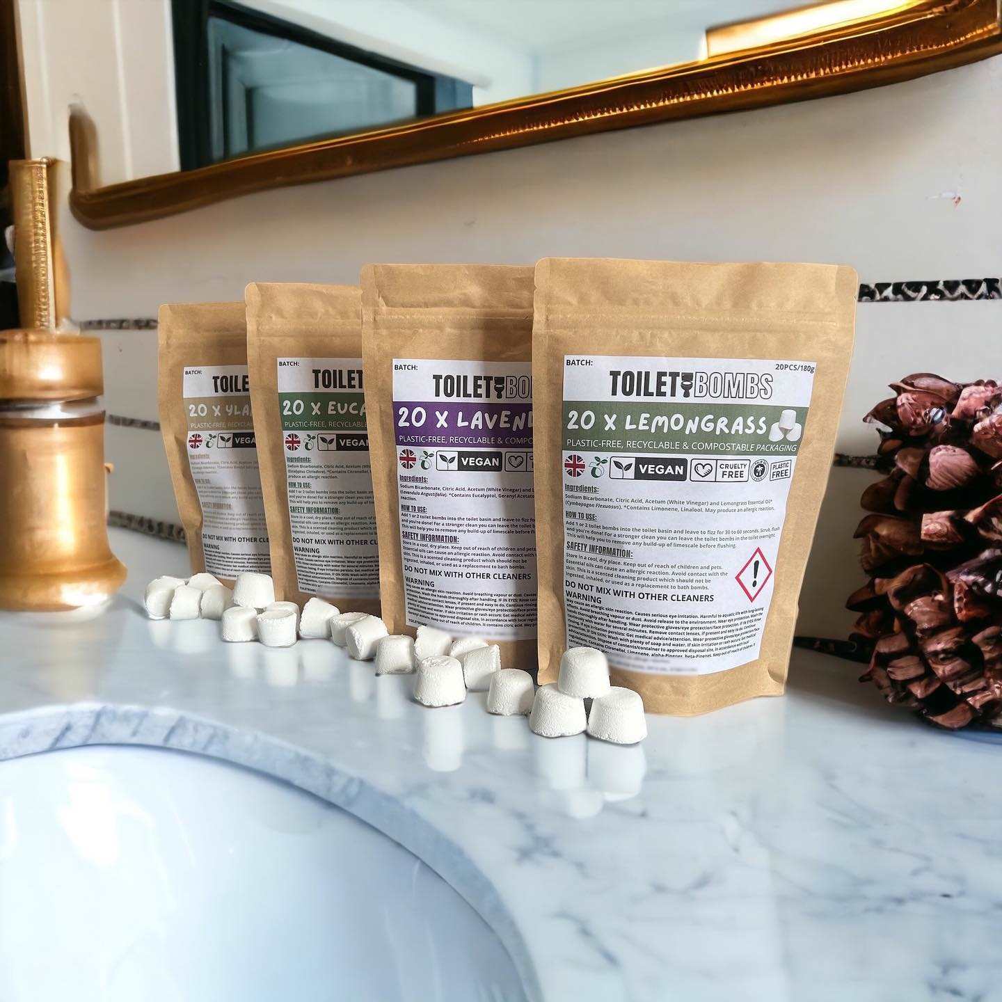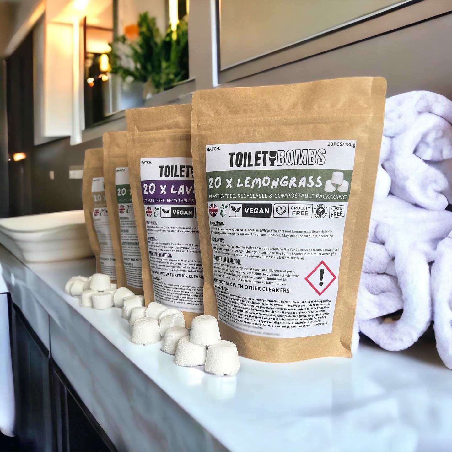 Each pack contains 20 toilet refresher bombs and comes in a reusable, resealable, recyclable, and compostable pouch, compliant with EN 13432-2000-12 standards.